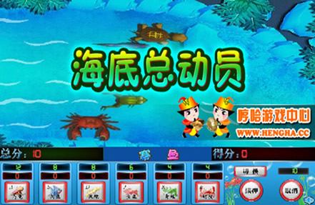 海底总动员是一款以鱼类比赛为主题的游戏,相当于人类活动中的100M赛跑比赛。大屏幕中有六条不同品种鱼:分别为(乌龟、剑鱼、泥鳅、金鱼、青蛙、螃蟹)在同一起跑线上,玩家猜中哪条鱼赢得这场比赛的冠军,就赢得积分,游戏规则简单明了,玩家容易操作上手。