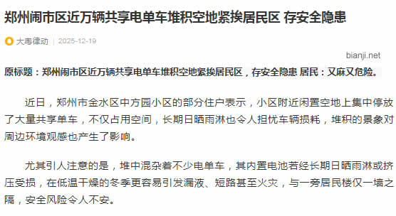 不少居民特别提出,这些车辆中包含许多共享电单车,其废弃电池在冬季干燥气候下存在较大火灾隐患,让人担忧社区安全。而且数量庞大的共享单车在楼下,有碍城市美观,但在社交媒体上发帖等并未得到有关部门重视。